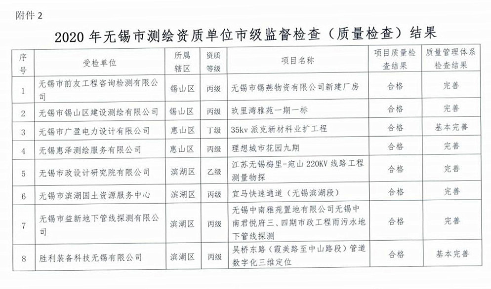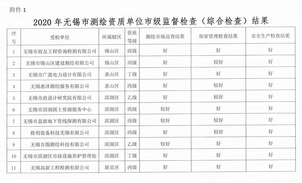 | 2020年無錫市測繪資質單位市級監督檢査結果出爐 | ||