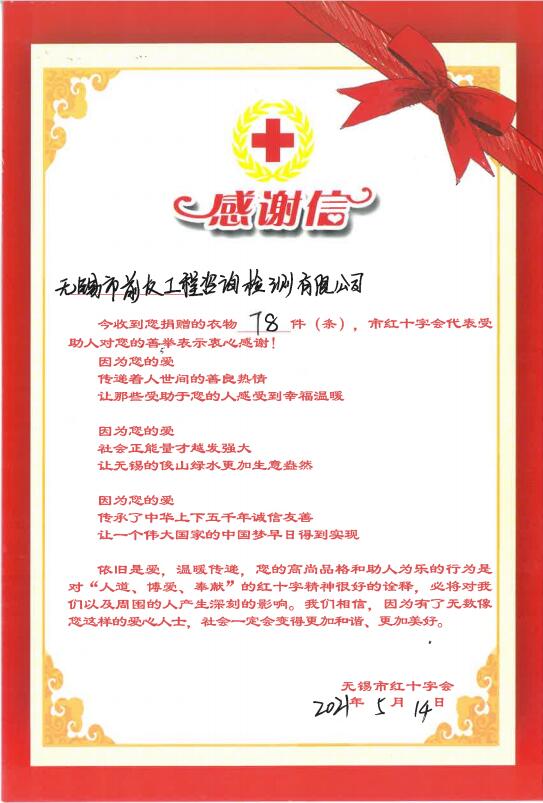 2021年是我們偉大的中國共產黨建黨100周年,在慶祝黨百年華誕的重大時刻,在“兩個一百年”奮斗目標歷史交匯的關鍵節點,無錫市前友工程咨詢檢測有限公司再次組織愛心衣物捐贈活動,以實際行動獻禮建黨100周年。 此次衣物捐贈受益對象為本市低收入家庭、殘疾人家庭、外來務工人員、遭遇突發事件陷入困境的家庭、對外援助貧困和受災地區,因此,本次活動得到了公司員工的積極響應和大力支持。廣大員工積極踴躍參加,整理家中閑置衣物。此次共收到員工捐贈的衣物90余件,從中選擇出符合捐贈要求的衣物78件,整理打包后已于5月14日送至市紅十字會統一捐贈。前友的發展得益于改革開放的偉大時代,前友人有一顆感恩的心。 本次愛心衣物捐贈活動,激發了公司員工參與公益事業、傳遞愛心的熱情,折射出了前友人身上所具有的助人為樂、無私奉獻的良好品格,彰顯了公司的社會責任感。讓我們繼續為愛助力,為實現中華民族兩個一百年的宏偉目標努力工作,付出自己的微薄之力。