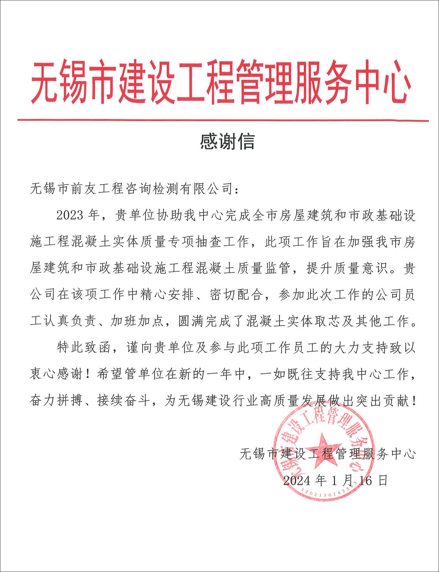 近日,公司收到無錫市建設工程管理服務中心感謝信。 2024.1.17 | ||