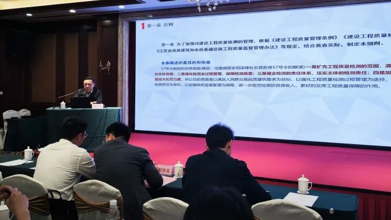 會議邀請省工程質量檢測行業專家范紅兵對《江蘇省建設工程質量檢測管理實施細則》進行了全文解讀。專家詳細闡述了《實施細則》的出臺背景、政策依據、主要內容及標準要求等,并著重對檢測活動管理、法律責任的相關條文及注意事項進行了深入的剖析,加深了各檢測機構對于《實施細則》的認識,為準確把握和執行《實施細則》提供了有力的技術指導。在最后的現場交流互動環節,專家對與會人員提出的疑問困惑進行了詳細解答,解決了各檢測機構在實際操作中存在的困擾。